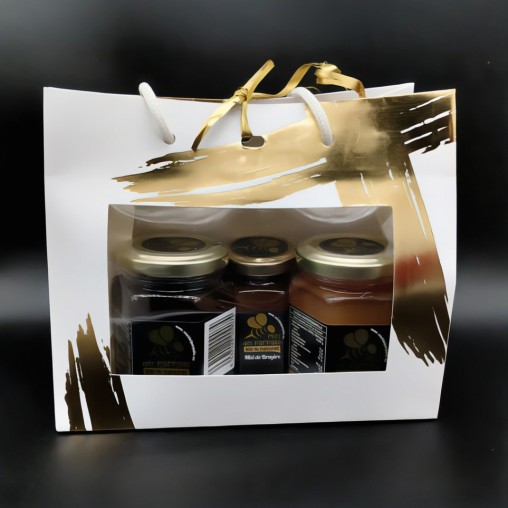 Bolsa de cartón con ventana decorada en oro que incluye 2 tarros de miel cruda de 250 g y 1 tarro de 140 g, todos a escoger. Presentación elegante, ideal para regalar sabor local y autenticidad estas Navidades.