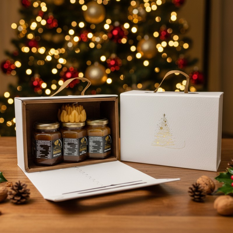 Presentación artesanal: la caja rígida blanca con asa de cinta dorada y decoración navideña hace de este pack un regalo elegante y sostenible. Cada detalle refleja el respeto por lo natural y el gusto por lo hecho a mano.