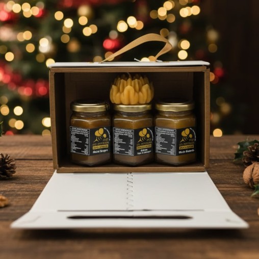 En su interior, encontrarás tres tarros de miel de 140 g, envasados en crudo (sin pasteurizar) para conservar todo su aroma y propiedades naturales. Elige tus variedades favoritas —azahar, romero, tomillo, milflores o brezo— y crea una combinación personalizada de sabores del Mediterráneo.