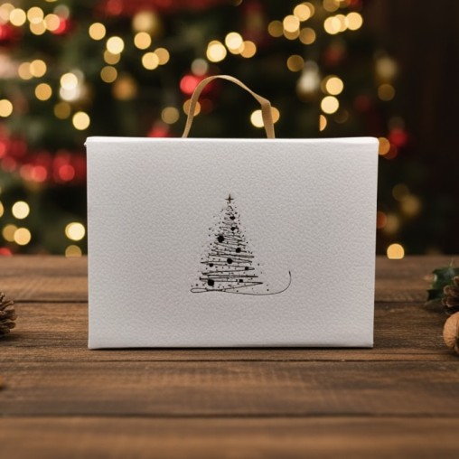 Presentada en una elegante caja blanca decorada con motivos festivos y asa de cinta, es un detalle perfecto para regalar bienestar y sabor en fechas especiales.