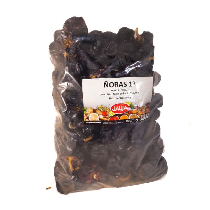 Ñoras secas de primera calidad JAUJA, en envase de 1Kg. Ingrediente indispensable en la cocina tradicional mediterránea, especialmente en arroces, guisos y salsas. Aportan un sabor dulce, intenso y característico sin picor.